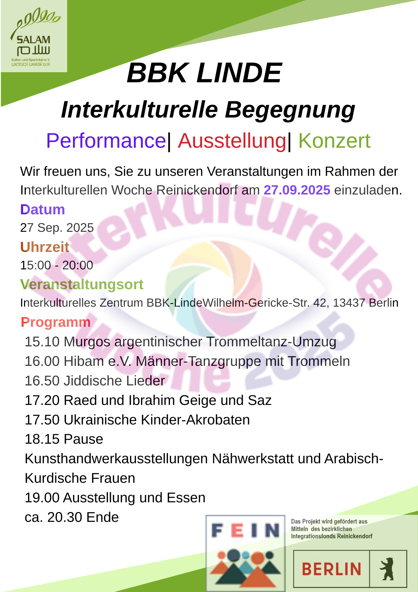 BBK Linde — Interkulturelle BegegnungenSalamSeptember 14, 2025Uncategorized Teile deine Liebe Salam Artikel: 88 Vorheriger Beitrag Rufe von den Wänden Nächster Beitrag Findungen, die Ausstellung im Oktober im BBK Linde